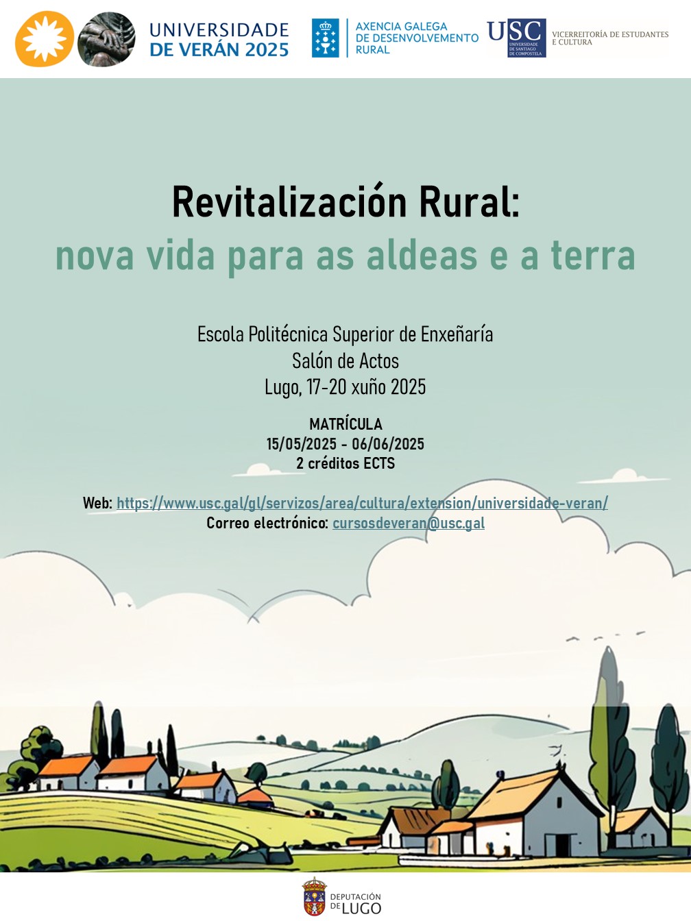 A vinte anos vista, como nos gustaría que fosen as nosas aldeas? Que retos necesitamos abordar? Como facelo posible? Como nos encamiñamos cara esa visión?  Con estas e outras moitas preguntas moi presentes, o LaboraTe organiza o curso  “Revitalización Rural: a nova vida para as aldeas e a terra” que se celebrará entre os días 17 e 20 de xuño en Lugo. Convócase no marco da oferta de cursos de Verán da USC, e  ten matrícula aberta ata o 6 de Xuño.
